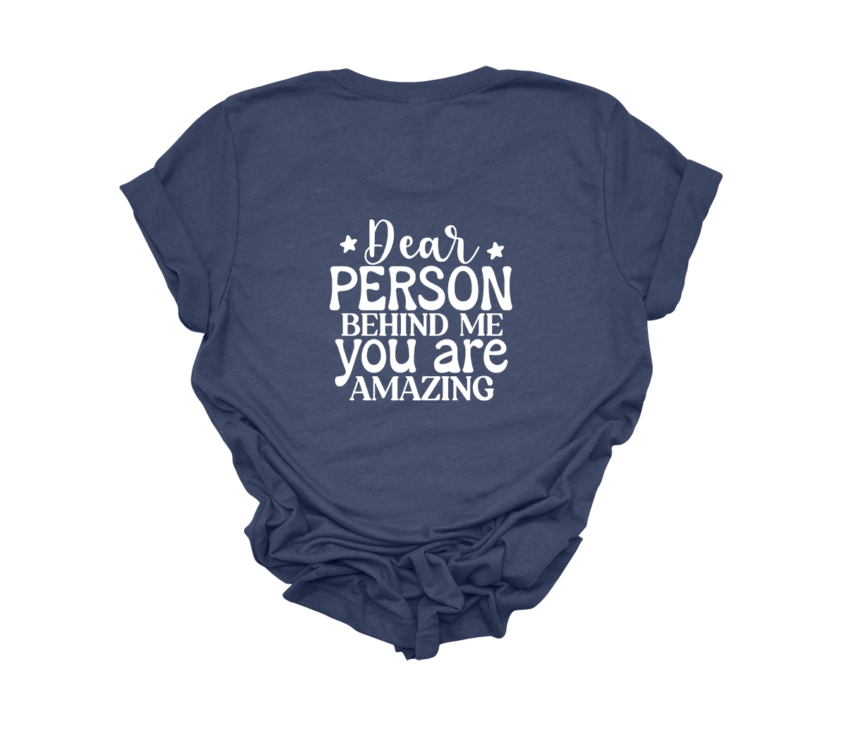Get your Townhall II custom t-shirt in a soft Heather Navy with the organization’s logo on the front and a positive message for those around you: Dear Person Behind Me, You Are Amazing!!!